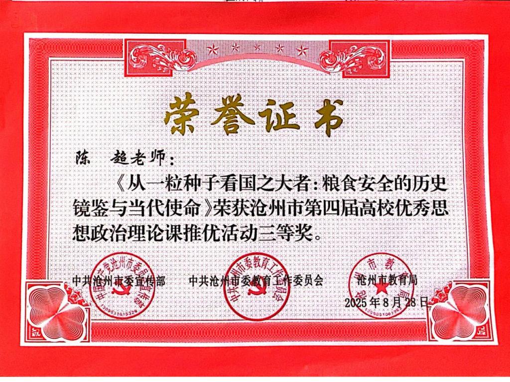 近日,沧州市第四届高校优秀思想政治理论课推优活动圆满落幕,sjb世俱杯三位教师凭借出色的教学表现和深厚的理论素养,在众多参赛者中脱颖而出,斩获佳绩。其中,孔琳老师的《五四运动——中国新民主主义革命的开端》荣获一等奖,贾淇老师的《中国特色社会主义进入新时代的基本依据及实践成就》和陈超老师的《从一粒种子看国之大者:粮食安全的历史镜鉴与当代使命》均荣获三等奖。这一成绩不仅彰显了sjb世俱杯在思想政治理论课教学方面的实力,也充分体现了sjb世俱杯教师扎实的专业功底和创新的教学理念。