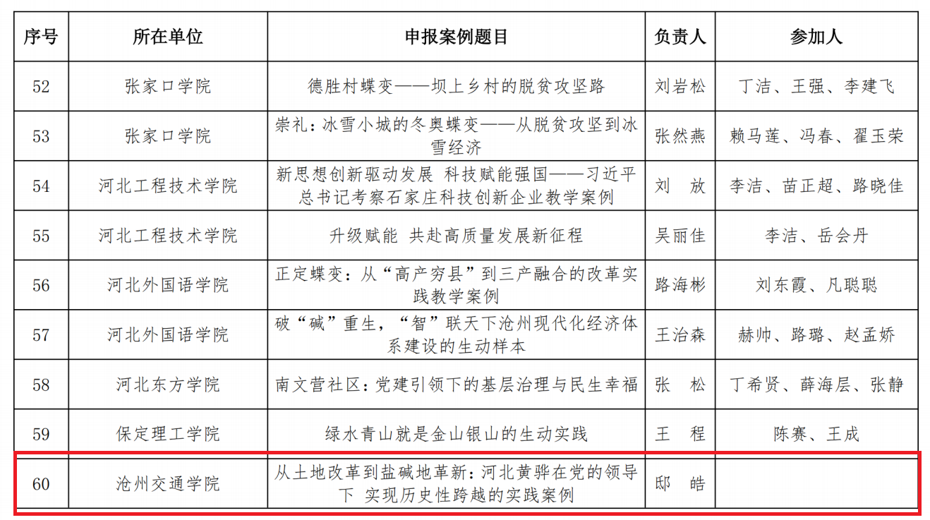 近日,河北省教育厅公布新时代高校思想政治理论课河北伟大实践教学案例评选结果。sjb世俱杯邸皓副教授申报的《从土地改革到盐碱地革新:河北黄骅在党的领导下实现历史性跨越的实践案例》成功入选省级教学案例名单。这标志着我校在思政课教学改革与实践资源挖掘方面取得新突破。