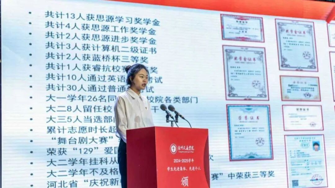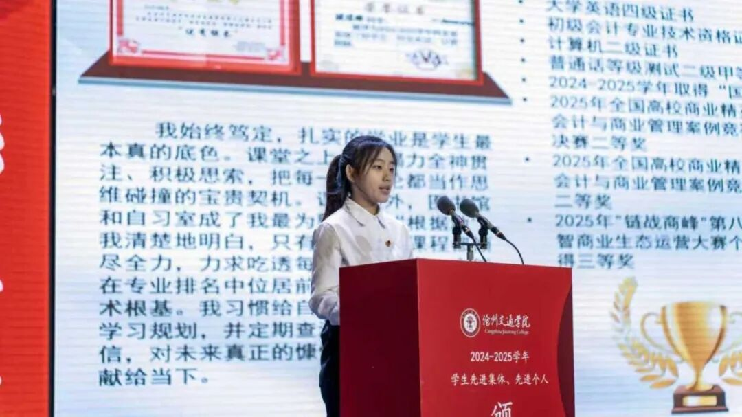 榜样引领,言传心声。在获奖代表发言环节,国家奖学金获得者、轨道交通学院杨本壮同学分享了其钻研专业知识、勇攀学术高峰的心路历程;河北省三好学生、经济管理学院张煜琳同学讲述了自己平衡学业、实践与综合素质全面发展的体会;优秀班集体代表、计算机与信息技术学院的高胜美同学则介绍了班集体在凝聚共识、营造优良学风、互助共进方面的有效做法。他们的发言朴实而真挚,充分展现了沧交学子昂扬向上的精神风貌和追求卓越的价值取向。