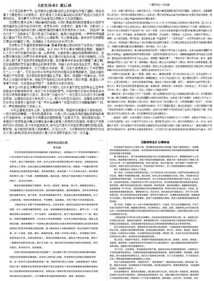 本次活动通过观看电影《建党伟业》,同学们增强了对党史的了解,同时,通过重温历史使他们明白,作为新时代的青年,应做到严于律己,勇于担当,敢于拼搏,为成为一名合格的社会主义接班人努力奋斗,为建设祖国大好河山贡献力量。