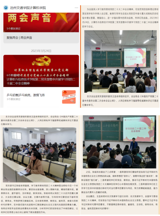 为深入学习贯彻落实党的二十届二中全会精神,计算机与信息技术学院第二党支部积极组织开展专题学习活动,确保将全会精神传达至全体学生党员。计算机与信息技术学院第二党支部通过集体学习等方式,深入学习《中国共产党第二十届中央委员会第二次全体会议公报》、人民日报和学习强国等权威媒体评论等内容。