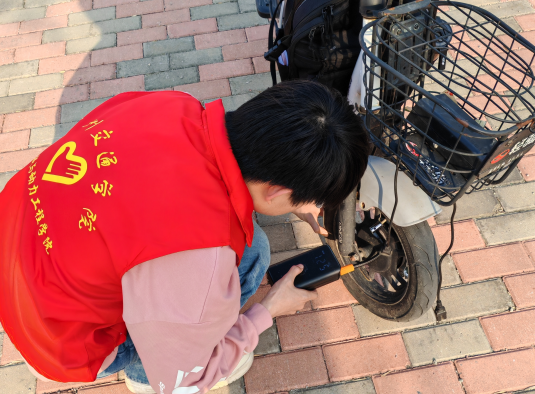 在活动现场,志愿者们分工合作,耐心地为同学们检查电动车、自行车车况,他们熟练地操作着打气筒,为车胎漏气的车子进行打气,确保每一辆电动车、自行车都能够安全上路。对于车闸存在问题的车辆,志愿者们认真进行紧固和调试,以确保车辆的刹车系统正常工作。还有一些同学的自行车座椅松动、链条掉落等问题都在志愿者的帮助下得到了解决。在这个过程中,志愿者们不仅传递了关爱他人,乐于助人的正能量,也展现了机械学子的专业能力。