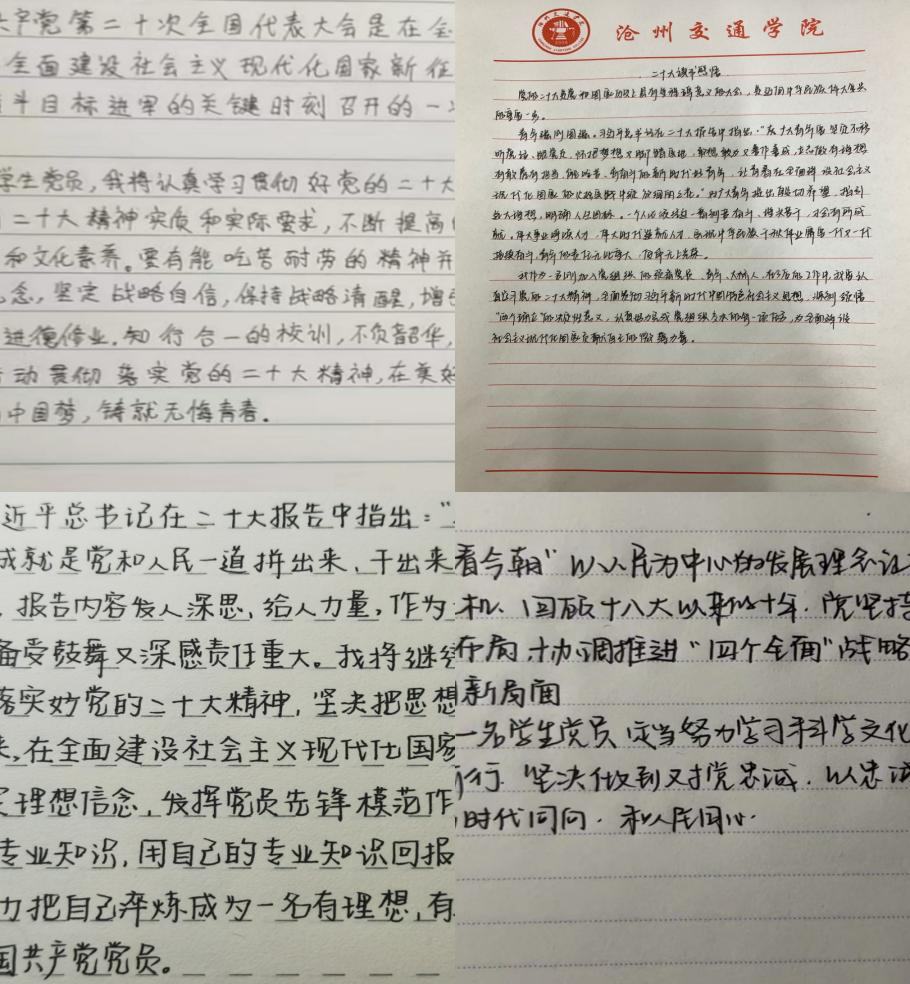 丁伶、张海宁等80余名学生党员纷纷向党支部递交手写感悟,积极参与主题征文活动。学生党员以奋进者姿态,将责任担当扛于肩上,将斗争根植于行动,全心全意向党组织靠拢,用青春告白祖国,勇当开路之先锋。