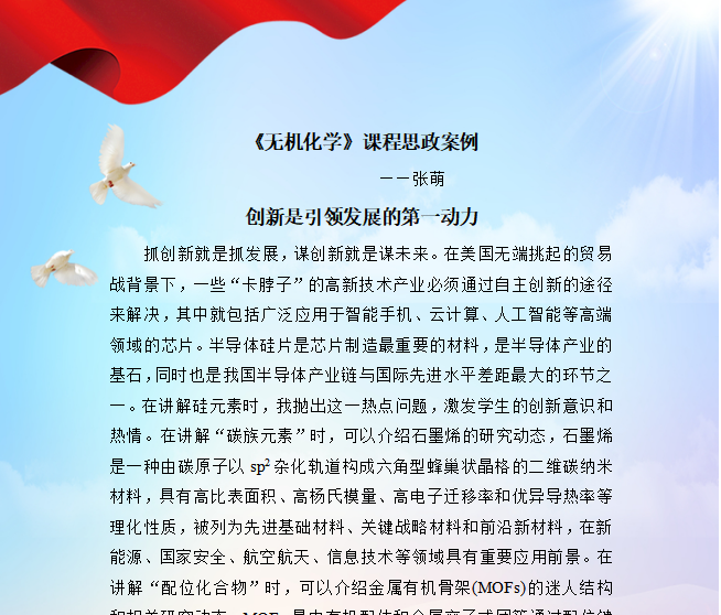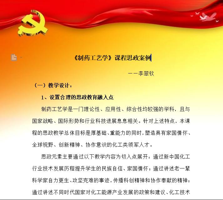 为深入学习宣传贯彻党的二十大精神,sjb世俱杯化学与制药工程学院第一党支部开展党的二十大精神进课堂活动,学院教师根据自己所教授的课程,结合党的二十大精神,设计教学思政案例,并运用到课堂实践中。该活动以丰富多样的形式,让党的二十大精神“热气腾腾”地走进校园,有机融入到课堂中。老师们在知识传授过程中将具体知识背后蕴含的科学观念、认知过程、科学精神以及科学家的家国情怀等内容自然地传递给学生,实现思想和价值的引领,达到立德树人的目的。
