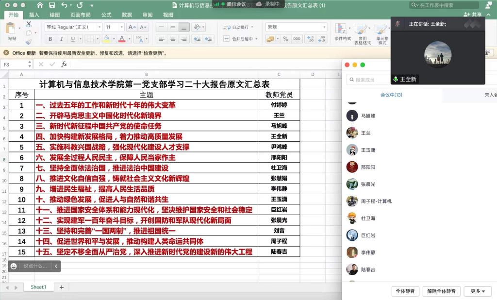 11月24日,计算机与信息技术学院开展“做好学习贯彻党的二十大精神的先行者”党日活动,第一党支部教职工党员采取线上的方式进行了学习。在主题党日活动中,全体党员围绕活动主题依次进行交流发言,分享学习心得。大家表示要将党的二十大精神转化为继往开来的强大力量,心往一处想、劲往一处使,以一流的工作状态、一流的工作精神、一流的工作质量,在新的赶考路上交出优异答卷。全体党员一致认为,党的二十大是在迈上全面建设社会主义现代化国家新征程、向第二个百年奋斗目标进军的关键时刻召开的一次十分重要的大会。要深刻领悟“两个确立”的决定性意义,增强“四个意识”、坚定“四个自信”、做到“两个维护”,踔厉奋发、勇毅前行、团结奋斗,奋力谱写全面建设社会主义现代化国家新篇章。
